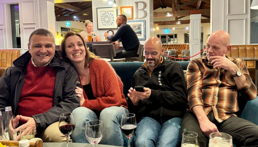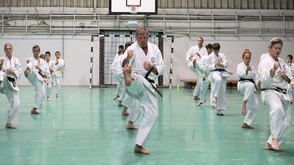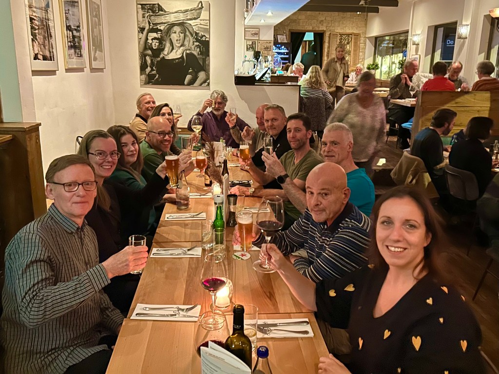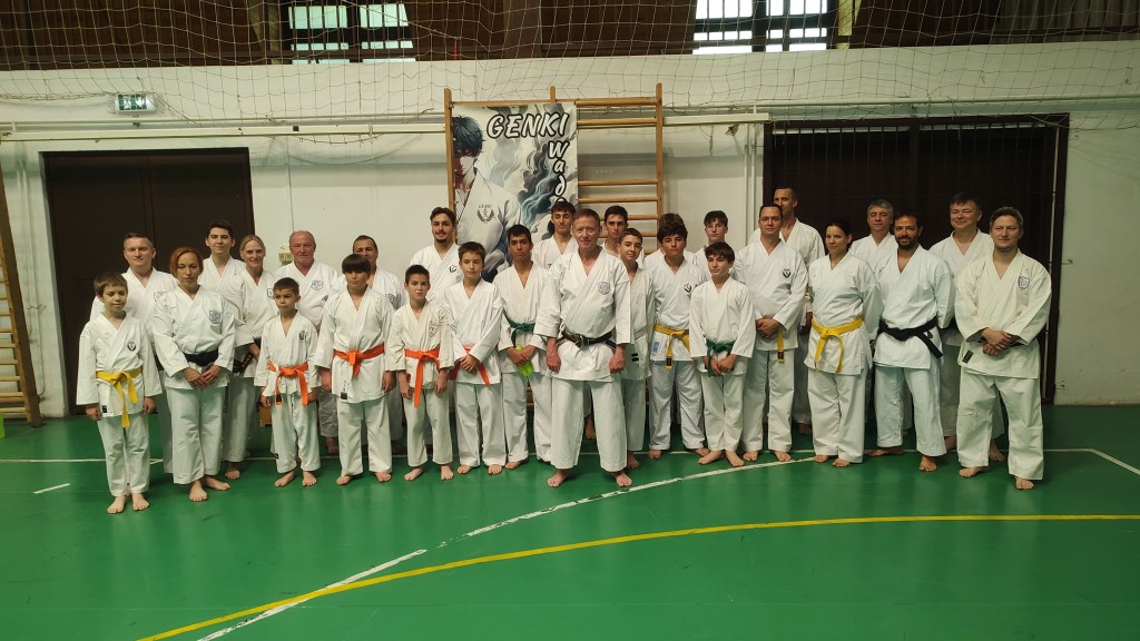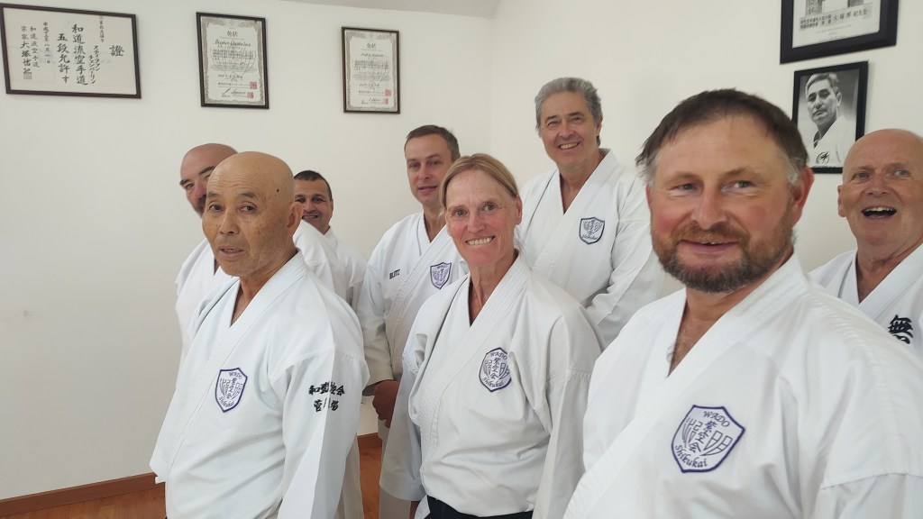 In the second session on Saturday, the group split so that students could practise paired kumite techniques appropriate to their grades. The final session was a moving tribute to our dear friend and fellow karateka, the late Tim Dixon, who sadly passed away in 2023. Tim’s favourite party piece at Shikukai gatherings was always to sing “Great Balls of Fire” and so everyone paired up and delivered Gyakuzuki one for one, without stopping and with Ki-ai throughout the entirety of the song (3 minutes!) Once training was finished and the obligatory group photo was taken, many of us headed to what used to be a pub called The Bear, and is now an Italian restaurant called La Vecchia Orsa (look it up on Google Translate se non parli Italiano). There we enjoyed pizza, birra, wine, pasta, bruschetta, wine, tiramisu and possibly a bit more wine, before heading off to the nearby Waverley Pub to round off an enjoyable and educational first day of the course.