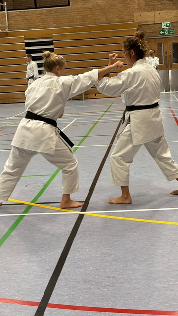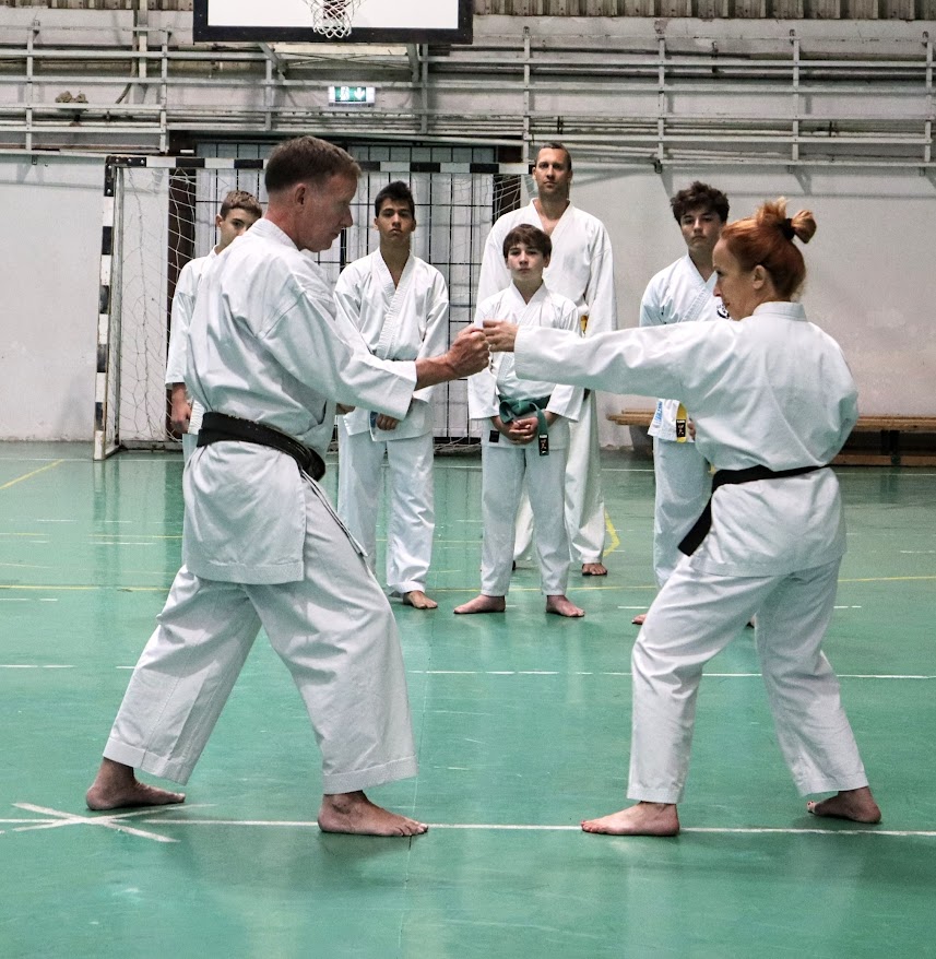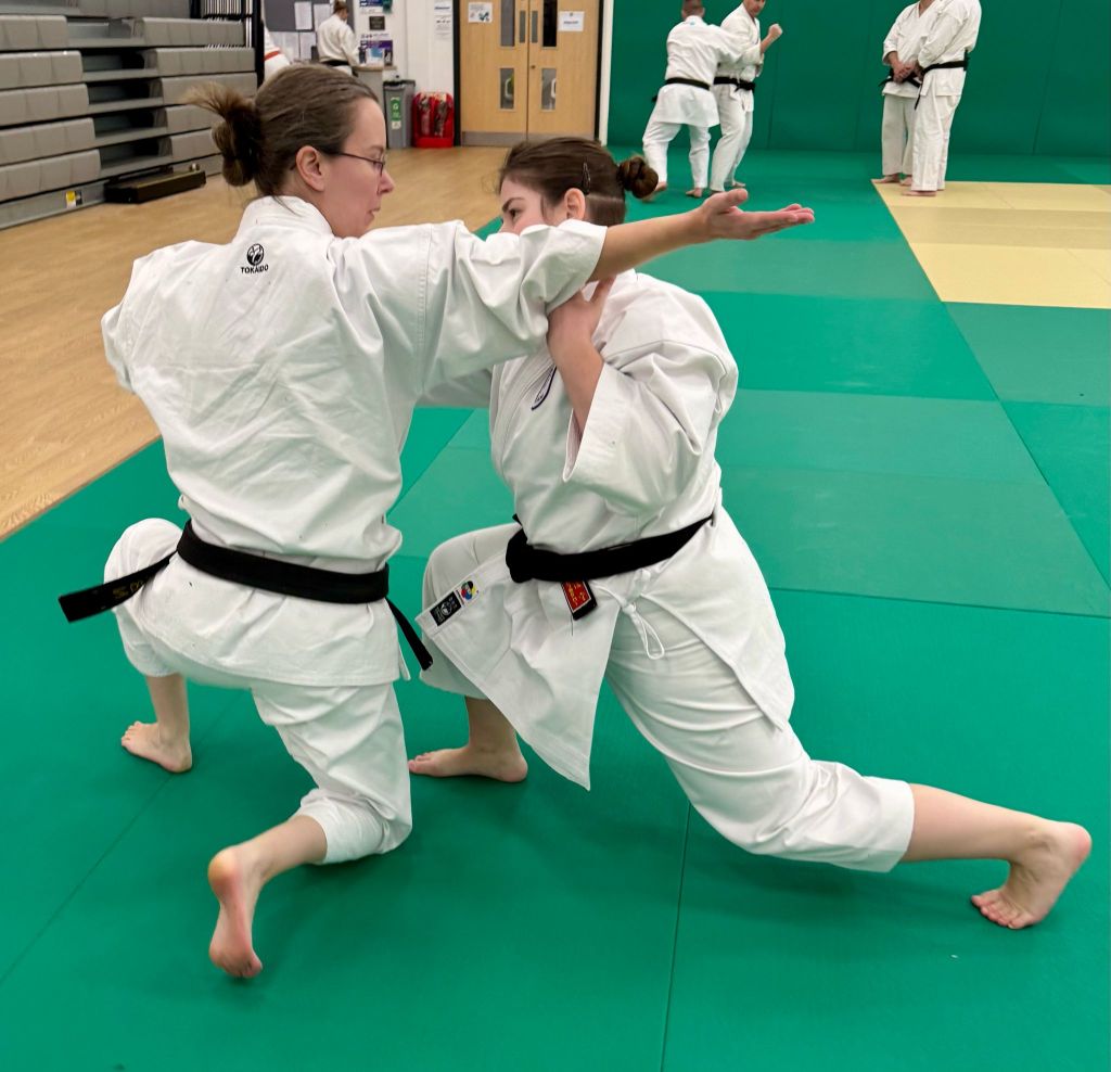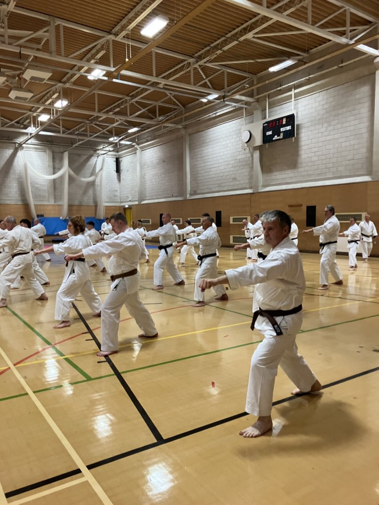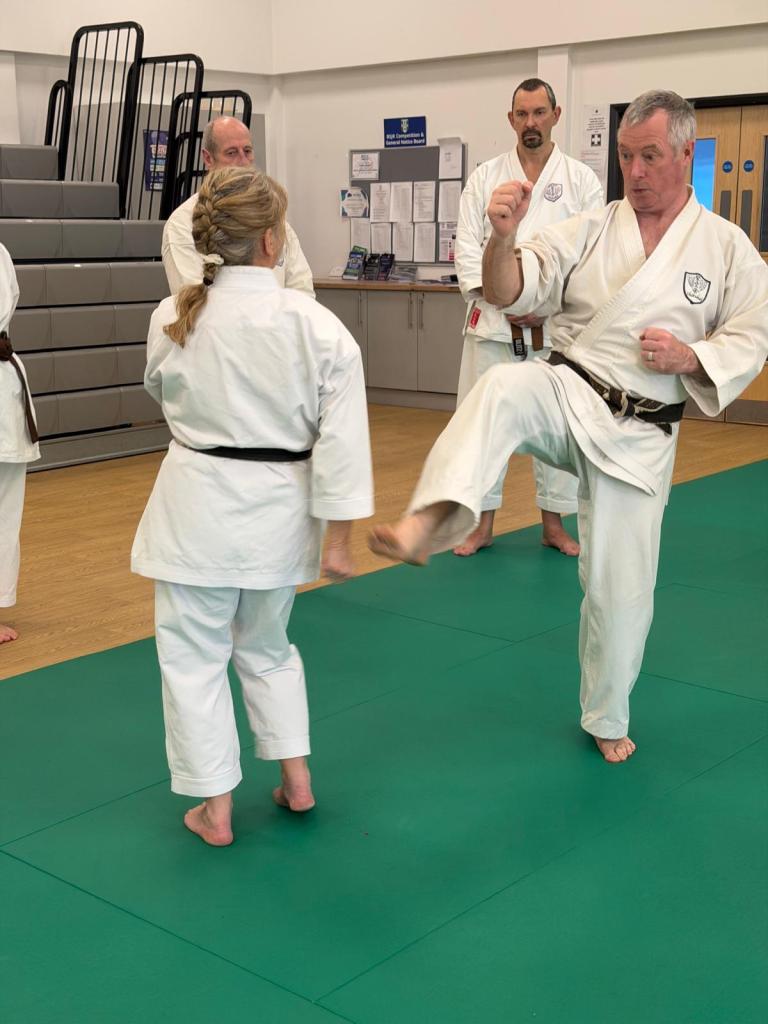 In the first session on Saturday, the group practised basic techniques, with instructors and Sensei demonstrating Tsuki and Kette from Junzuki, Gyakuzuki, Junzuki no Tsukkomi and Gyakuzuki no Tsukkomi stances. Students planning to take 1st Dan or higher Dan grades in the next 12-18 months received particular scrutiny, which was much appreciated even though a few pieces of Sensei’s advice had to be repeated due to being unwittingly aimed at Andrew Skelton’s bad ear. (He wasn’t ignoring you, Sensei – honest!)
