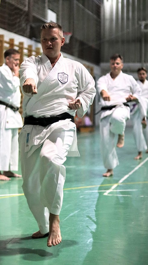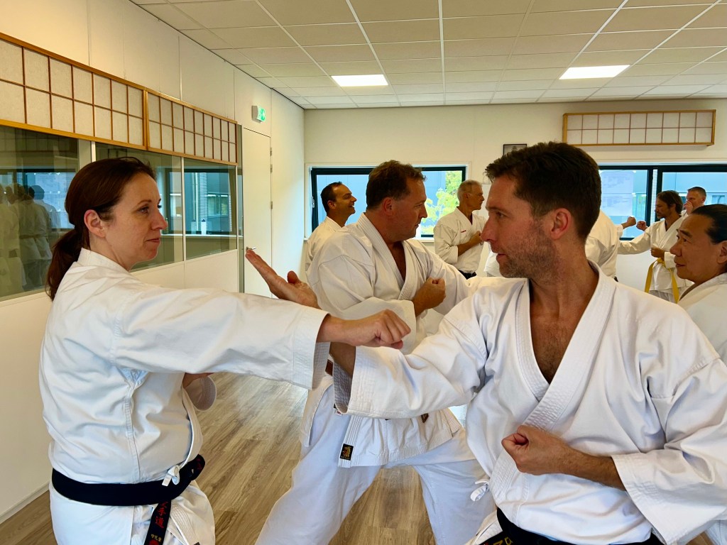 On Sunday, the first training session was led by Sugasawa Sensei. After a short but necessary reminder of how to make a fist in the correct way (with the thumb over the index and part of the middle fingers), this session focused on the concept of Koshi wo Kiru, which is the hip/core movement used to generate energy for techniques. Sensei emphasised that this movement is different from the movement used to initiate turns, or Mawasu. While Kiru is smaller in terms of the range of movement it produces, it is much more concentrated and forceful. Sensei also explained the connection between breathing, Kiru and the all-important Hikite movement, which balances the action of the striking hand and is therefore a key ingredient in making techniques sharp and fast (as demonstrated by Sensei Gary Ockwell).