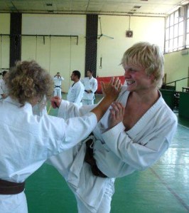 We then applied the technique in pairs moving up and down the hall in Gyaku Gamae. In pairs the efficiency of the technique became clear. Tori’s defence ensured that while disturbing the balance of Uke by redirecting their attack, it maintained contact and therefore some control over Uke’s punching arm and therefore their posture. Tori’s offensive technique built upon this Kuzushi element with a strike to the face that slid up Uke’s arm (Noru) while deflecting the arm down further compromising Uke’s posture. As a final illustration of Tori’s dominance, a second move was added to the technique that opened up Uke for a follow up technique. Tori moved inside (Uchi) by moving their punching arm to strike to the face with the back hand.