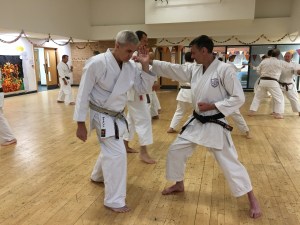 In preparation for pair works Sensei Tim had the class practice the techniques to be employed by Tori against a Chudan Zuki in our lines. During this preparation stage the initial emphasis was on the defensive Jun no Naiwan Nagashi Uke. Finally, the offensive technique was included that further opened the hip and drove the up-turned fist Jodan in a move reminiscent of Pinan Godan, before the jump. No emphasis was placed on the defensive Ten-i movement as this is a response to the depth of Uke’s attack and came into the pair work later, but body rotation, Ten-tai and technique, Ten-gi were well illustrated. Also, the economy of movement (Mudana Ugoki) and absence of any tension or unnecessary power (Mudana Chikara) made Sensei Tim’s demonstration highly effective, composed and compact, not something I was able to reproduce.