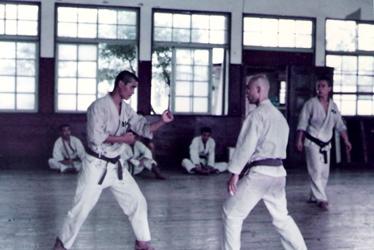 The prestige of the karate club depended upon its success in the Inter University championships; ninety percent of training was geared towards this end. Training was hardcore involving endless drilling in the fighting techniques of the day. Sugasawa Sensei says that these techniques were very limited in scope, they did what they did to score the points needed in the competition arena. The fight preparation was tough and the fighting was equally spirited and demanding.